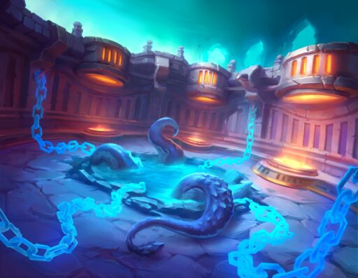 「ヨグ=サロンをやっと捕まえた!どうやって収容しておく?」 「すぐ下にある…露天掘りした穴に入れて…ゆるい鎖4本でつないでおくのはどうだ?」 「カンペキ!」
