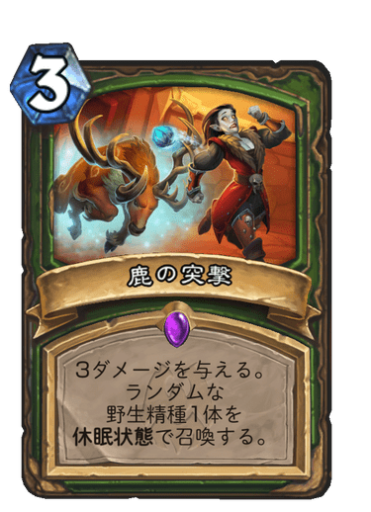 鹿の精霊が封印された、ハンタークラスのマナコスト3に属する呪文カード。 手札から使用(プレイ)することで、鹿の頭突きを自在に操る「ディアーチャージ」という技を放つ。